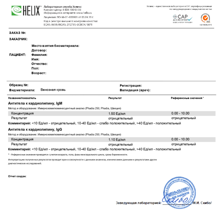 - Наличие антифосфолипидных антител, включая антикардиолипиновые антитела IgG, IgM и IgA в высоком и среднем титре, волчаночный антикоагулянт, ложноположительный результат антикардиолипинового теста/микрореакции преципитации на сифилис, антител к бета-2-гликопротеину IgG, IgM и IgA) – 1 балл;